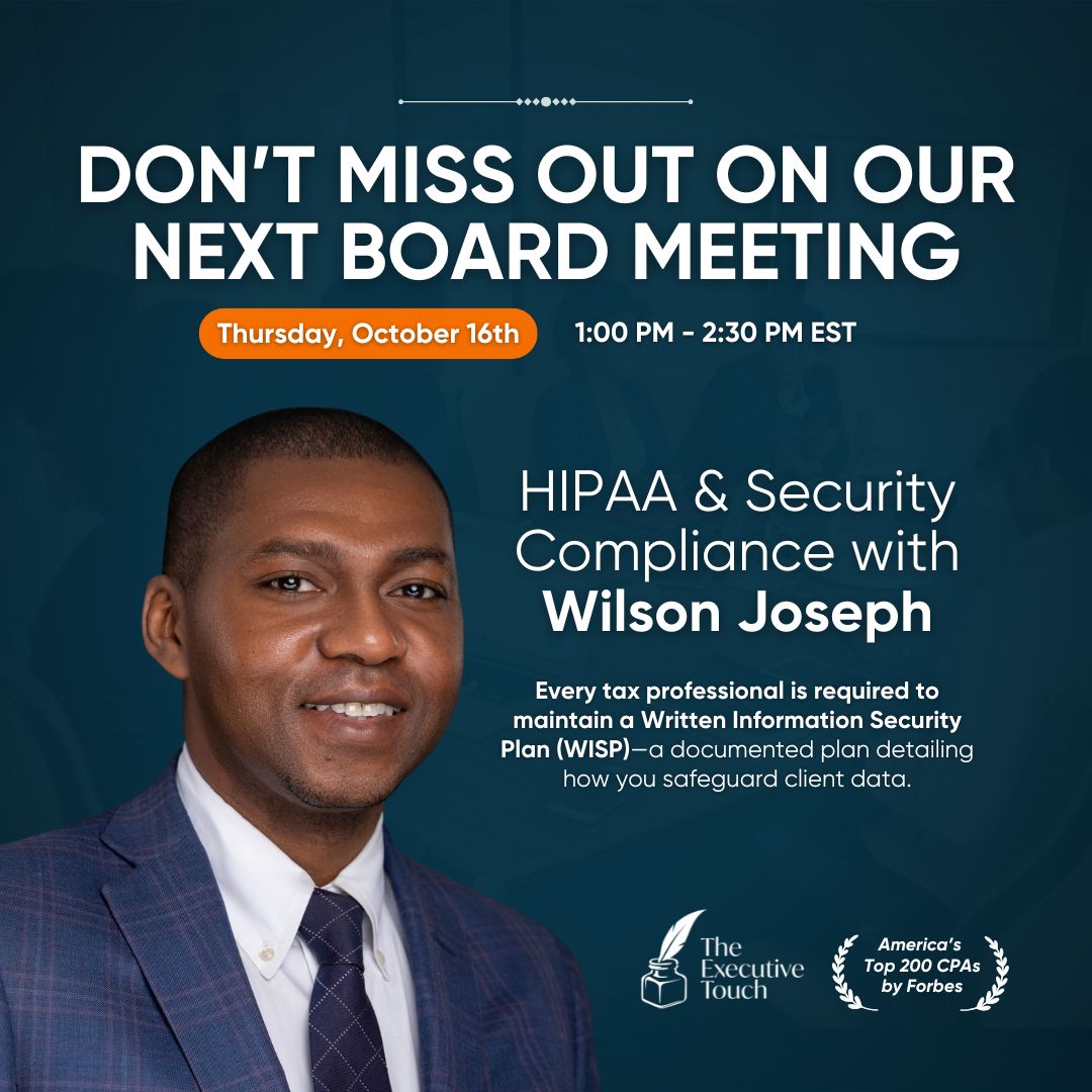 This month’s Board Meeting will feature a special discussion on Cybersecurity, HIPAA, and the WISP Requirement for Tax Pros — including actionable steps and templates to implement your WISP